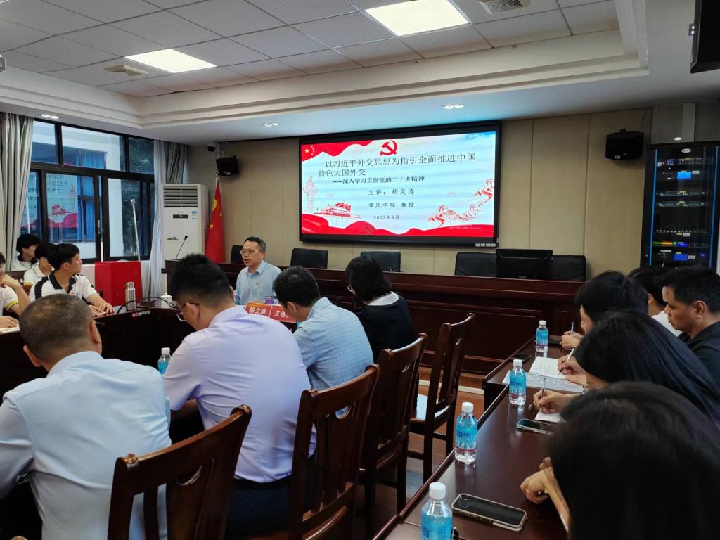 胡文涛介绍了党的二十大报告关于十年外交工作的总结,表示要以习近平外交思想为指导,努力开创中国特色大国外交新局面,为全面建设社会主义现代化国家营造良好的外部环境:一要深刻领悟习近平外交思想坚持独立自主,捍卫国际公平正义的使命意识;二要深刻领悟习近平外交思想引领外交工作的实践意义;三要深刻领悟习近平外交思想与时俱进、守正创新的理论品格;四要深刻领悟习近平外交思想坚持胸怀天下,推动构建人类命运共同体的世界意义。